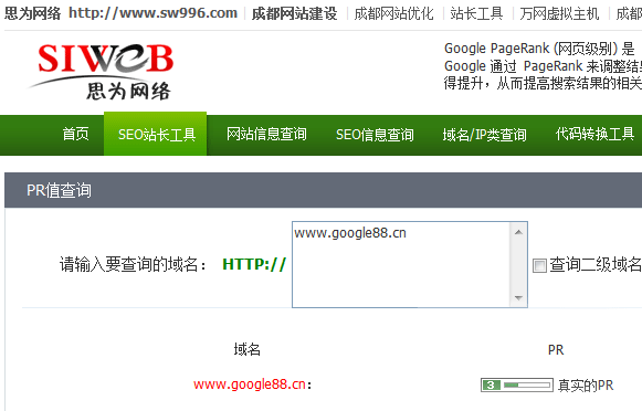 2011年1月Google對衡量全球網站權威性的重要指標PR值(PageRank),進行了小規模的更新。在此次更新中,思為網絡:成都網站建設網站(http://www.google88.cn/)的PR值被再次上調到3 ;另一網站: http://www.sw996.com PR值是5 沒有進行更新