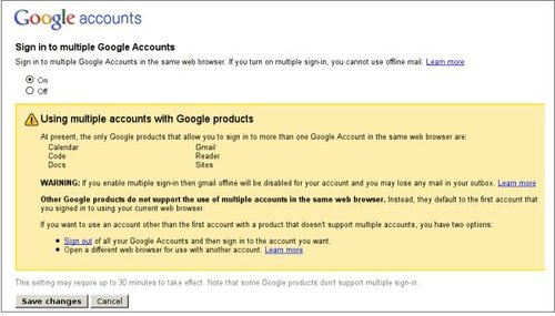 Google正在測試多帳戶混合登錄功能,就是說你可以同時在一個瀏覽器里登錄多個Google帳戶,目前支持Gmail(不包括離線模式)、Google Calendar、Google Reader、Google Docs、Google Sites和Google Code,不過相信今后會有更多Google服務加入到多帳戶混合登錄大家庭里來。